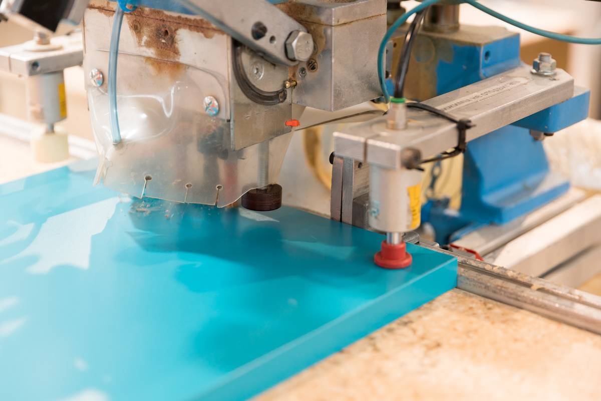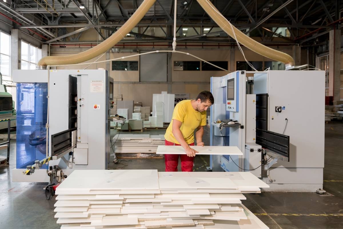 На станке Holmza (Германия) лист ДСП распиливается на части нужных размеров. Оборудование управляется компьютером — погрешность при раскрое минимальна. Материал располагается на воздушной подушке, которая защищает его от царапин.